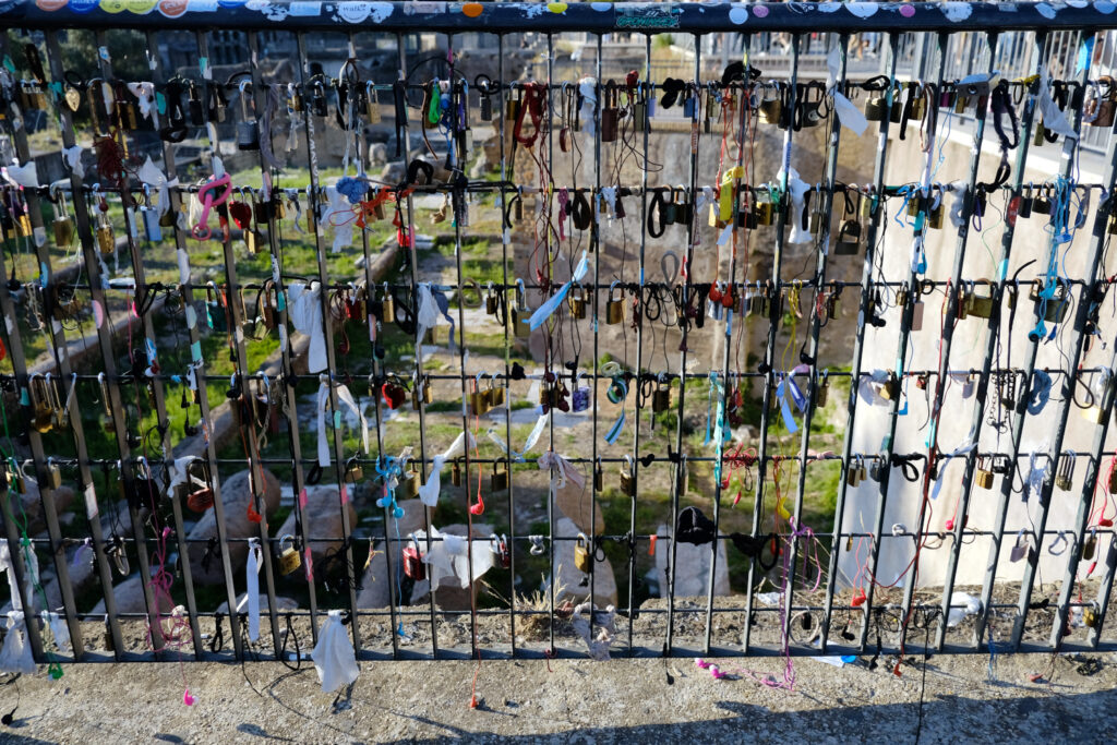 La costumbre de colocar candaditos para significar el amor (vaya asociación, por cierto) ha calado tanto que en París recogen toneladas de candados del puente donde empezó la bobería. La tal se extendió a velocidad de Covid a lo largo y ancho de este nuestro planeta. Roma, claro, no ha escapado a tal virus que, además, ha mutado. Ahora le añaden otras cosas más ramplonas (como los amores de hoy en día): cascos, cables, pulseras, alguna corbata… Condones no vi, mire ud., con lo bien que cuadran con el tema amoroso.