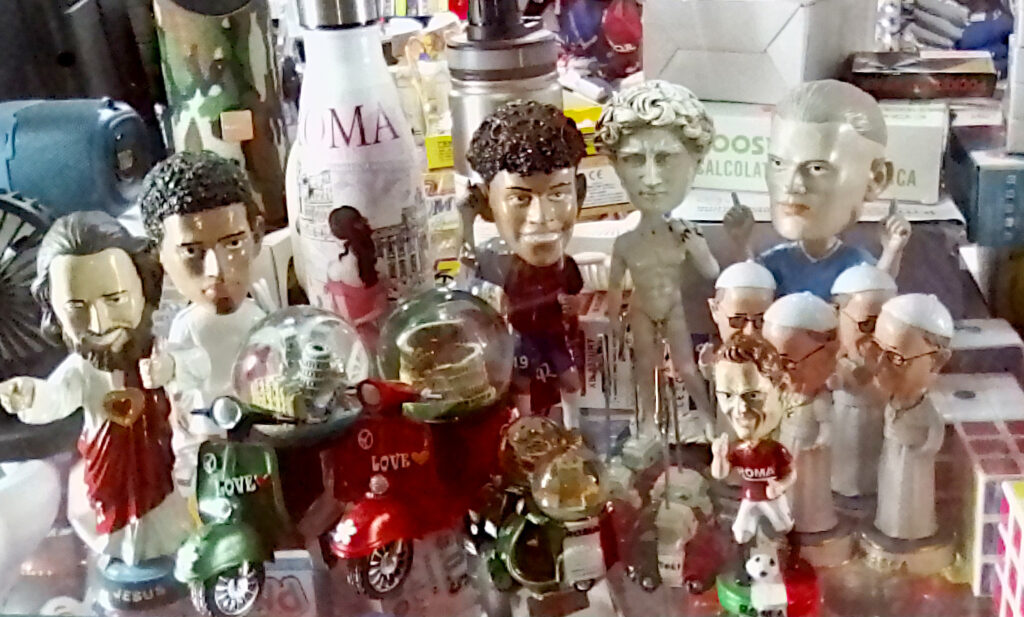 Los nuevos dioses acompañan en el «panteón» a los viejos ídolos. La prueba la tienen en la foto hecha hace pocos días en una tienda de pakistaníes, el equivalente a las de sudamericanos que tenemos en España o como los bazares de los chinos ampliados a comidas y bebidas. La estantería de regalos del escaparate tiene a varios futbolistas, al papa, a Jesucristo, vespas, bolitas de nieves… De fubolistas y papas vengo sabiendo lo mismo que de los precios del saltamontes frito en Tailandia (si es que comen), así que los aficionados que hagan la identificación por su cuenta.