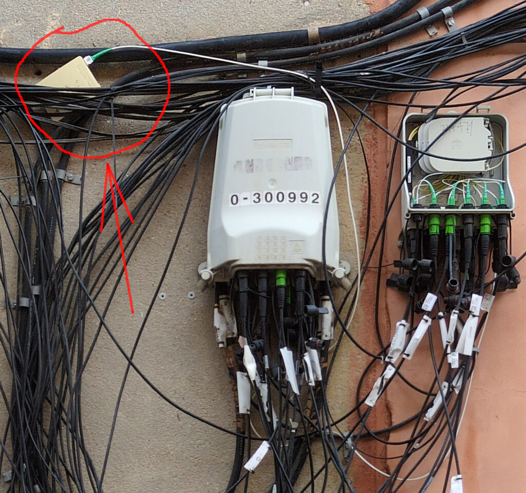 Actualización: me fijo bien en la foto y veo que además, y para completar el chapuz, hay entre los cables una caja de terminación de fibra óptica interior. Vamos, la que se instala dentro de nuestras casas.