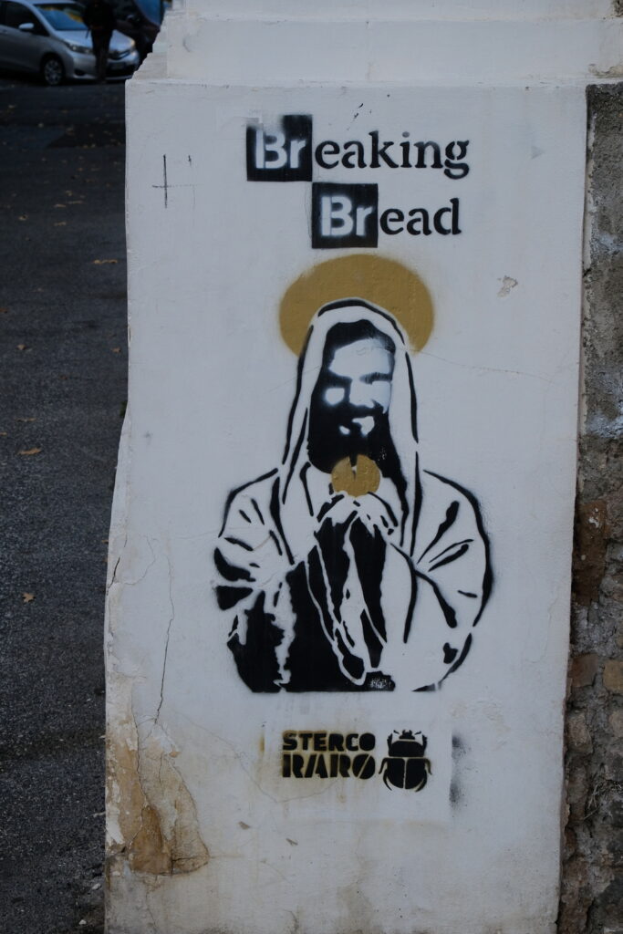 A veces (solo algunas) la gente que hace pintadas tiene buenas ideas, creativas y hasta decorativas en un cierto sentido. Es el caso de esta que he pillado en un barrio eminentemente universitario de Roma, San Lorenzo. El personaje de aura dorada que rompe un círculo dorado -semejando a Jesucristo- con la leyenda «Breaking bread» en clara alusión al hecho que desarrolla (romper pan) y el nombre de una vieja serie «Breaking bad» (Haciéndose malo). En la serie un profesor universitario se dedica a fabricar droga para pagarse un tratamiento contra el cáncer que le han diagnosticado. Hasta el cartel imita el logotipo original recuadrando las dos Br.