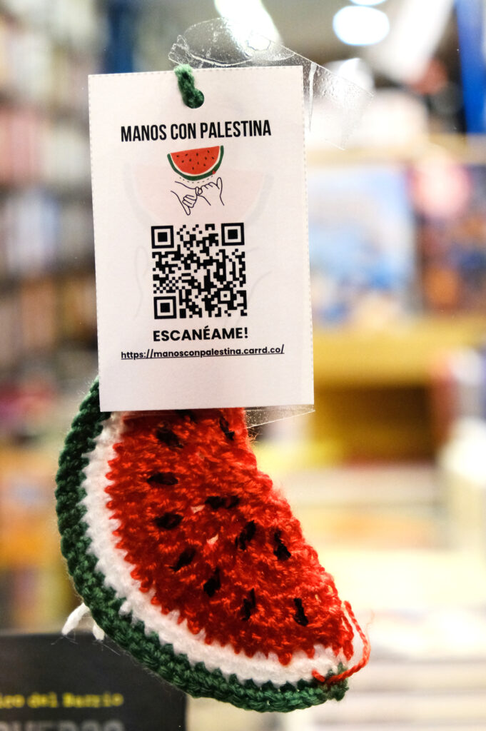 Ayer me llamó la atención encontrar una sandía de punto (o ganchillo, no sé bien la diferencia) colgando en el escaparate de una librería de Salamanca. Es la de la foto. Además incluye un Qr como mandan los cánones de estos tiempos y una dirección web donde se explica el sentido de esta acción. Hay también enlace a un pdf con más información y sitios donde ampliarla o actualizarla.