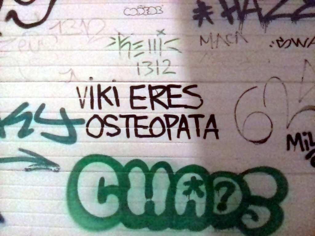 Hace años apareció en las calles salmantinas una pegatina que se esparció por la ciudad, el mensaje que tenía era: «Viki eres muy fea». Me suena haber publicado una entradita con el asunto, pero no la he encontrado, así que puede que mi memoria o la de la web estén fallando. También me suena haber leído en algún otro blog los improperios que alguien lanzaba contra la pintada que era interpretada como «machista». Todo esto sin saber si Viki era de un sexo, del otro o de ambos. El caso es que el otro día me encontré esta versión nueva que, sin embargo, no estaba en una pegatina sino en una pintada en un garaje de la calle Fernando de la Peña. Aquí se la dejo sin más comentario porque creo que esta noche no he bebido lo bastante como para comprenderla.